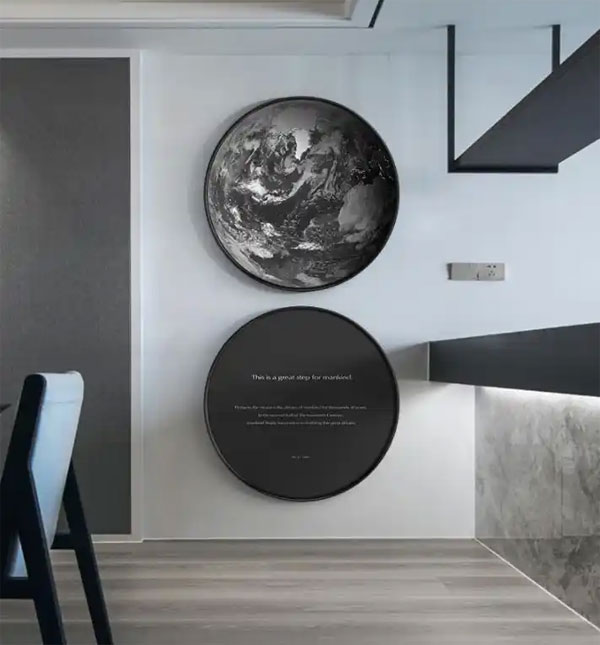 玄关上选择太空主题的装饰画,科技元素加上黑白色调,将宇宙的深邃,厚重感完全的展现出来。